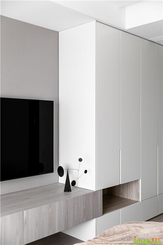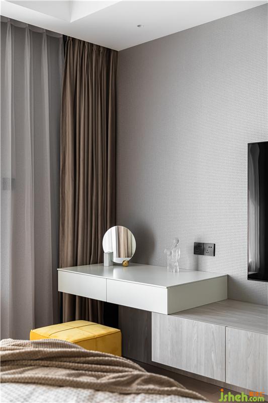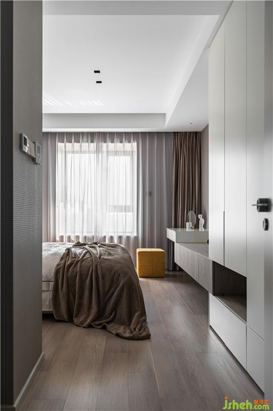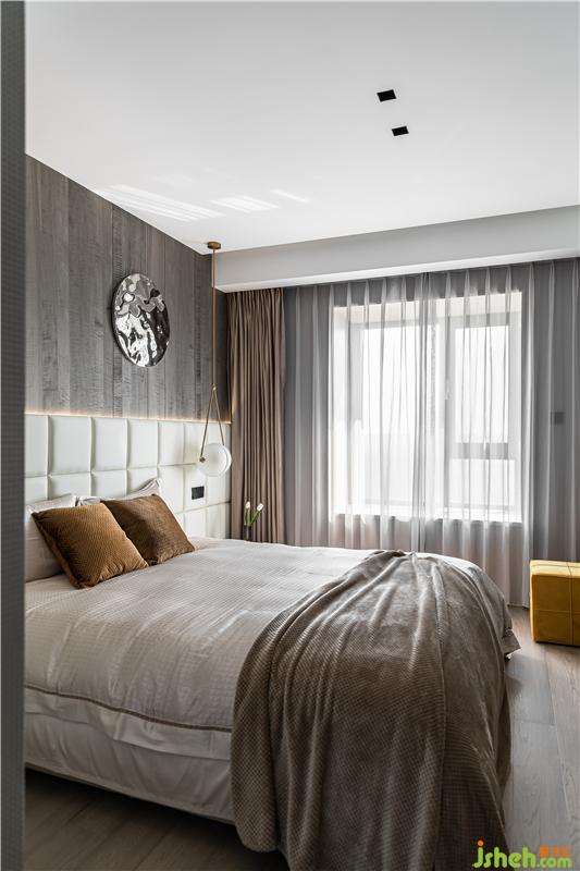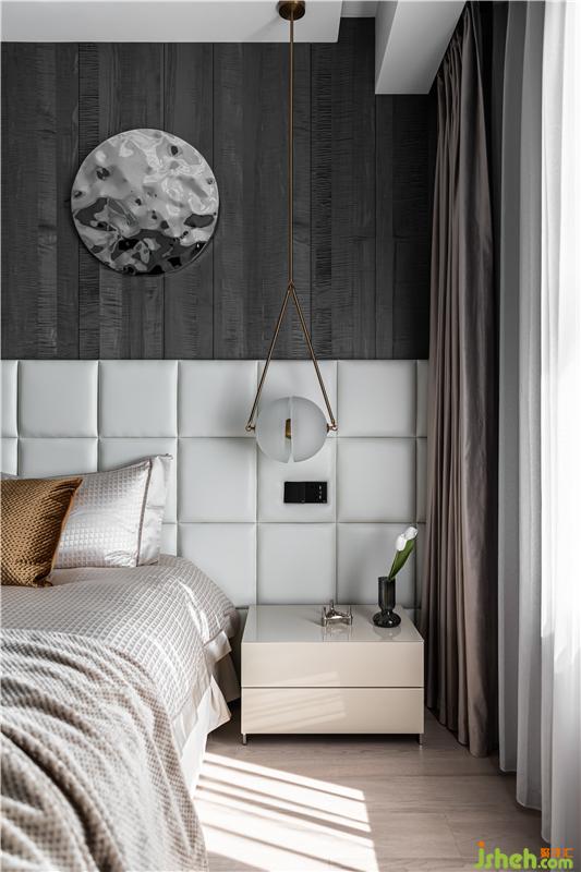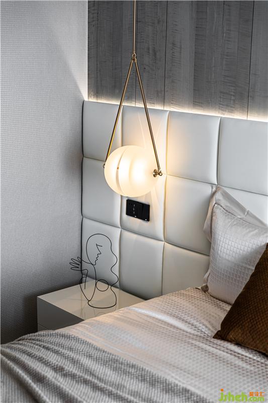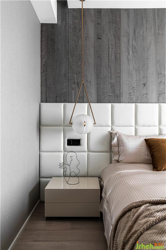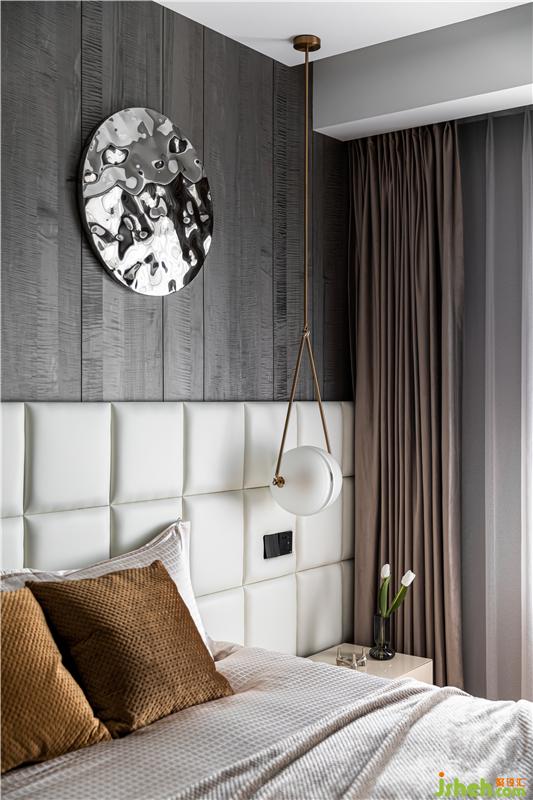 主卧宁静雅致,暗纹高级质感进口墙纸满铺,方块巧克力装的软包一字排开,取代了常规的床头设置,杭州家居装修设计在点线面的排布中有着熟稔自如的转换,且蕴藏丰富的细节。