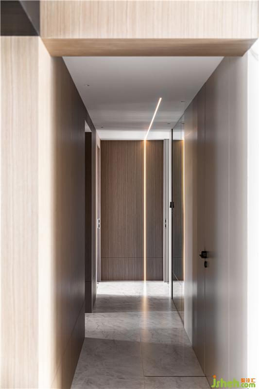 廊道的设计同样拒绝繁复,木饰面的转折,玻璃镜面的破切,线性灯延伸勾勒,显得松弛又充满韵律感。