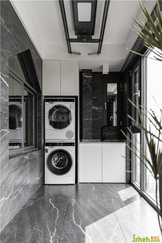 杭州家居装修设计兼具晒台和洗衣功能的多功能性阳台,洗衣机烘干机叠加使用,满铺深色纹理大砖,先扬后抑的手法将晒台与地台融合一体,无一不体现设计师的精巧心思。
