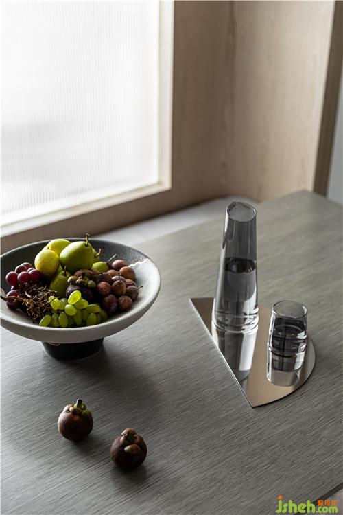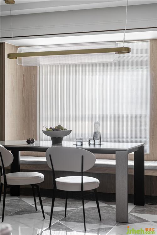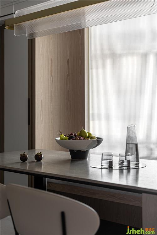 由于狭长户型以及卧室位置的局限,客餐厅采光受阻,室内设计师在餐厅用玻璃隔断重新组织分区,将光线引入.