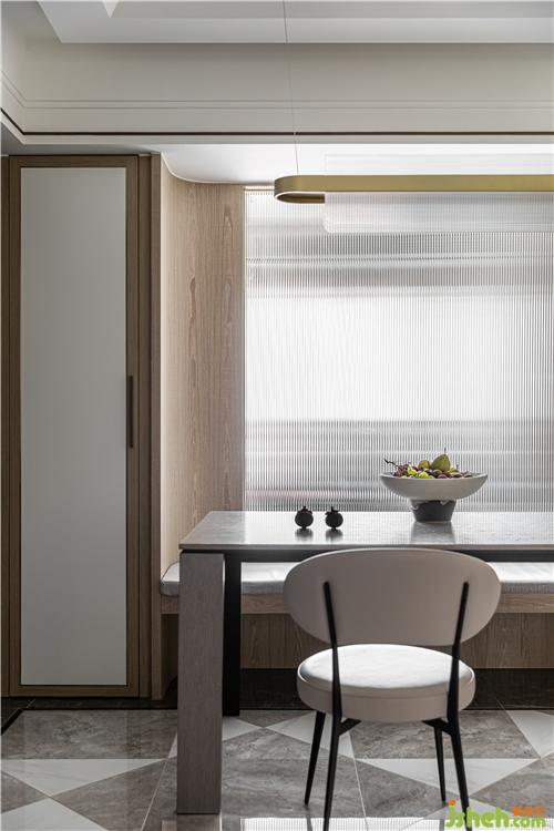 The shop that follows guest dining-room floor tile sticks a form, the compact sense of long and narrow corridor is blurred. Extremely narrow frame brunet ark door and flat plate wood color ark door collocation, eliminate triviality line as far as possible, maintain concise visual experience.