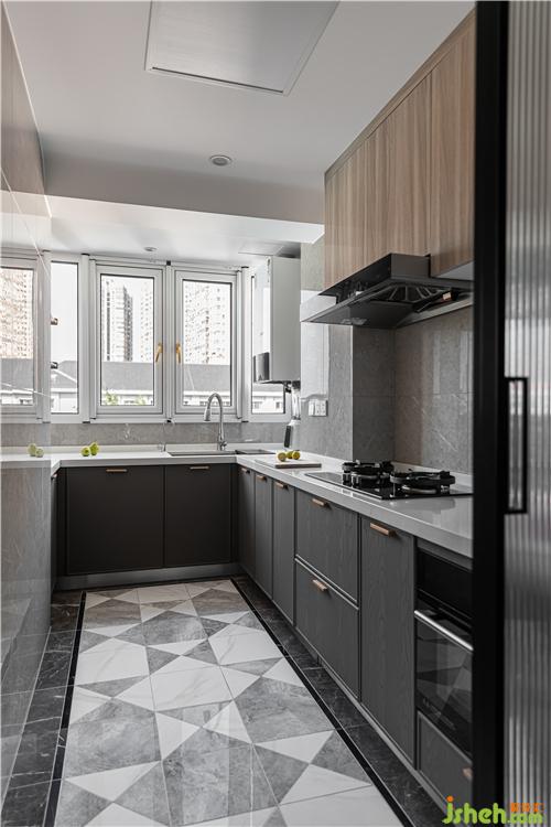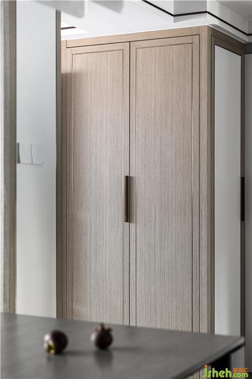 沿用客餐厅地砖的铺贴形式,虚化狭长走道的紧凑感,极窄边框深色柜门与平板木色柜门搭配,尽可能消除琐碎线条,维护简洁的视觉感受.