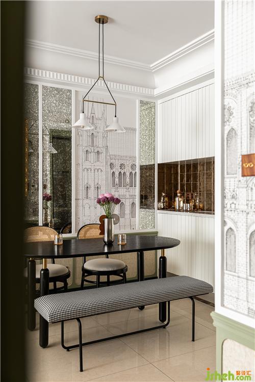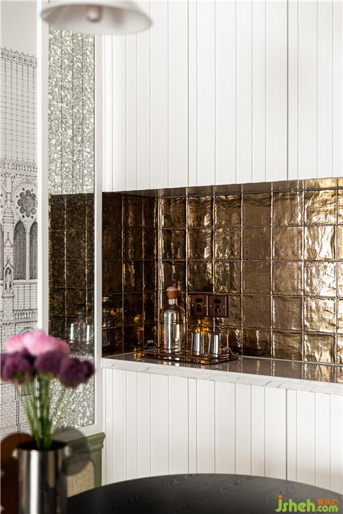 入户右侧乳白色餐边柜搭配金属釉面砖,个性又复古.