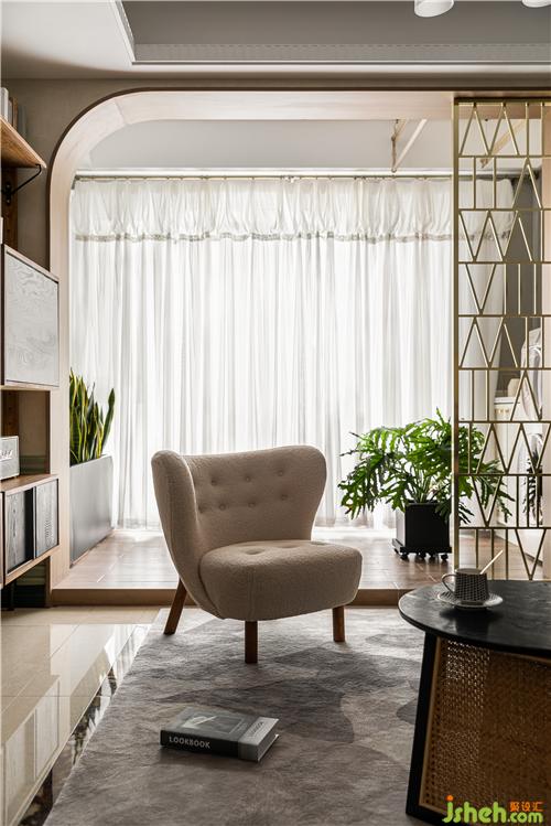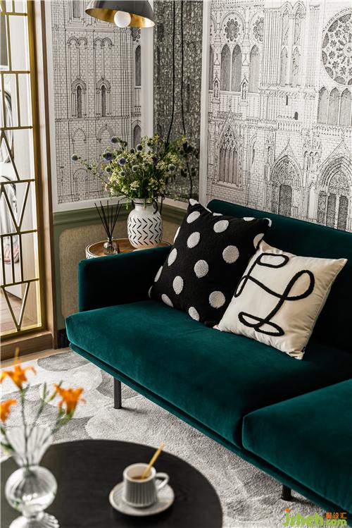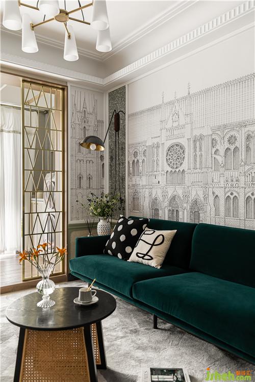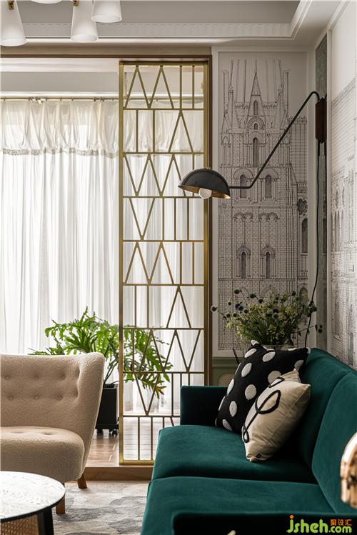 A continuous space in the living room, the walnut-wood customized exhibition frame and gray-bean Green Wall integration, light familiar with the wind of the movie scene came into being, Dark Green Velvet Sofa touch delicate soft, should be the main color of the space tone green, copper partition and straw-made coffee table collision out of the old-fashioned mix style. Soft transparent gauze curtain, precipitation of the space temperament.
