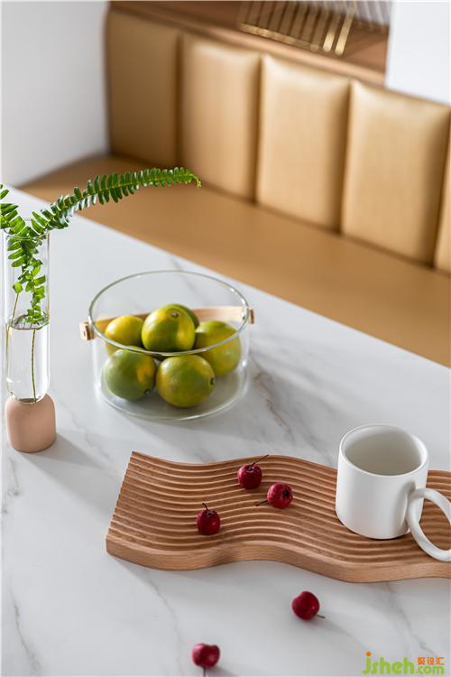 户型面积不大,采光又集中在厨房和阳台,所以采用开放式厨房的设计,将厨房的光线最大程度的引入室内,让三个平行区间保证视线流通.厨房里最美的烟火气,不是一个人的锅碗瓢盆,而是一家人的欢声笑语.