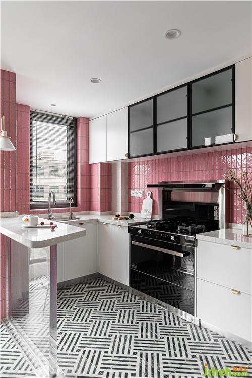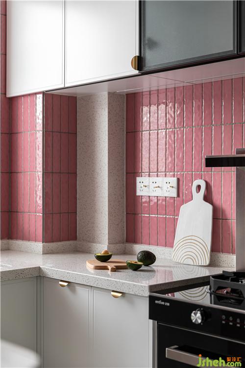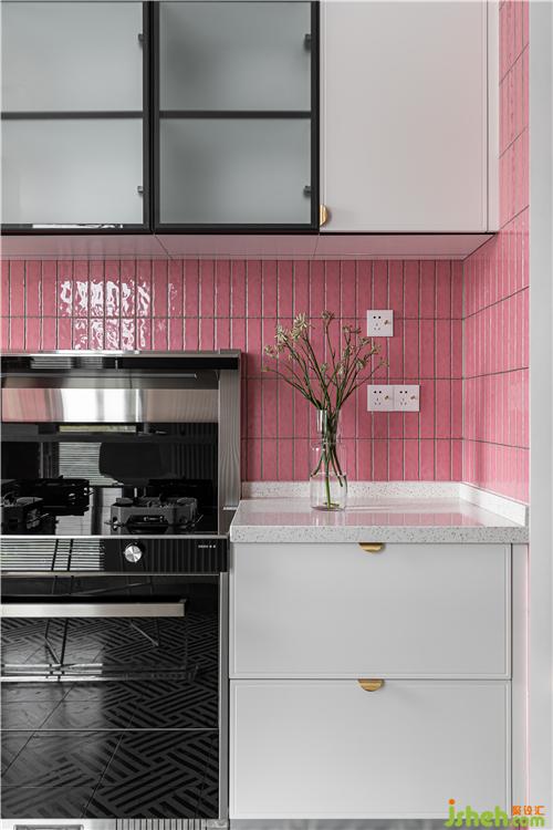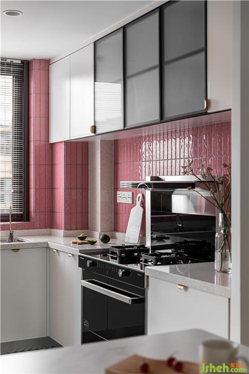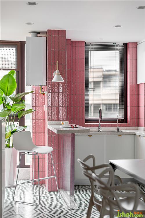 厨房的最大的亮点就是大面积小粉砖的铺贴,将这个小小的厨房衬的温馨自然.