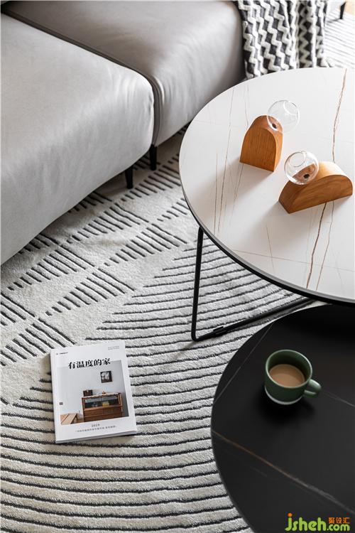 客厅的布局落落大方,浅灰色的沙发搭配浅色条纹地毯以及圆形高低茶几,使空间温暖而又不失格调.