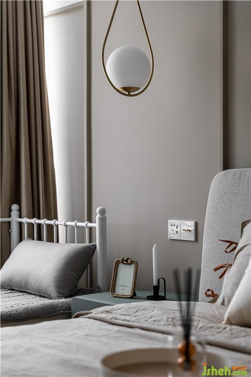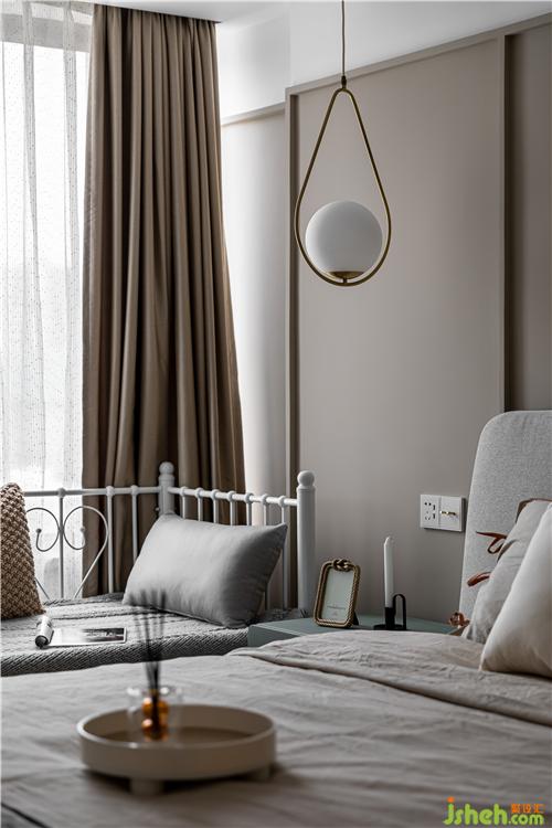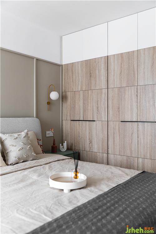卧室内各种相近色系,床背景、床品,木色柜门,褐色窗帘.让不同的纹理相互平衡融合,使空间整洁舒适带来素雅、淡然之美.