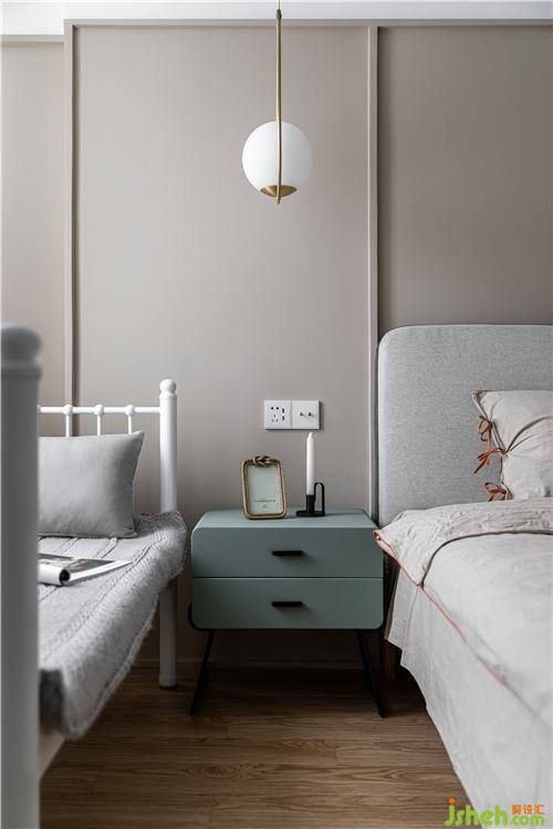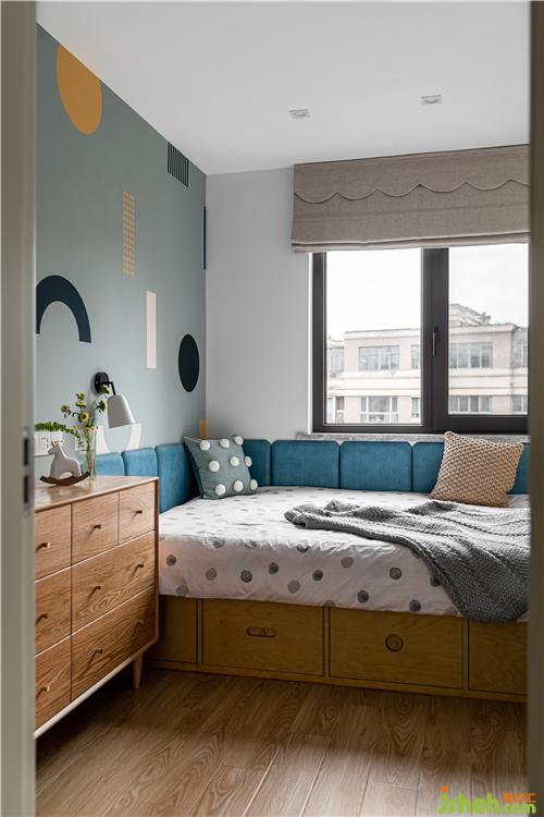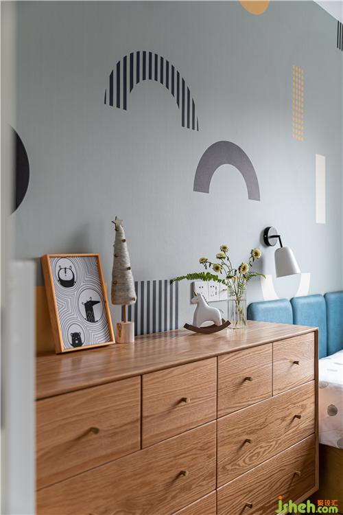Children's room space is divided into a part to the dining room, using the concession space on both sides of the refrigerator, designed two groups of cabinets to meet the storage needs of children's room.