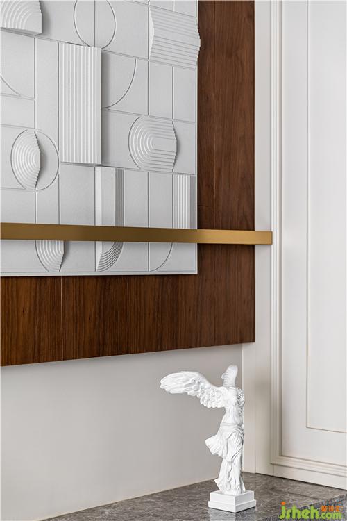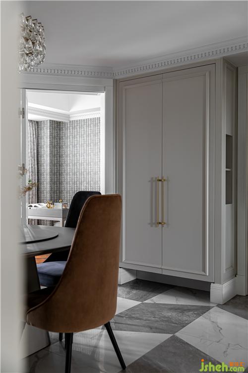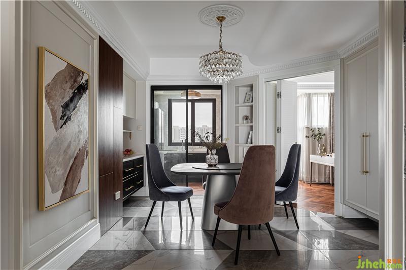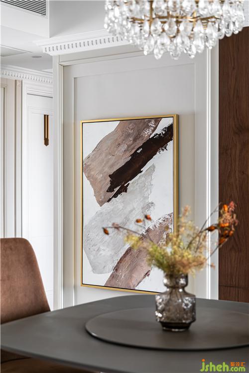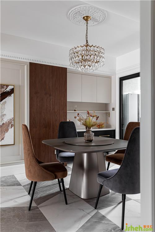餐厅是推门入户的第一视角,整体想要营造出一种精致优雅的轻复古风;PU线条、叠级护墙、高踢脚与胡桃木饰面碰撞融合形成餐厅的主背景,也构建出了整个客餐厅的主旋律;石膏灯盘、水晶吊灯、黄铜支架和黄铜拉手等一系列经典的美式元素,与简洁摩登造型的家具融合,既复古又时尚.