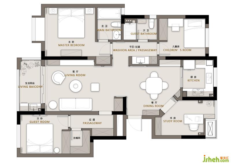 1. 取消入户门厅,书房内退,空间划入餐厅,扩大餐厅空间的同时削弱入户的局促感.