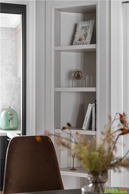 鞋柜延用护墙的造型线条,高踢脚部分挑空,便于临时存放鞋子;侧面设置开放格,进门物品可随手放置.
