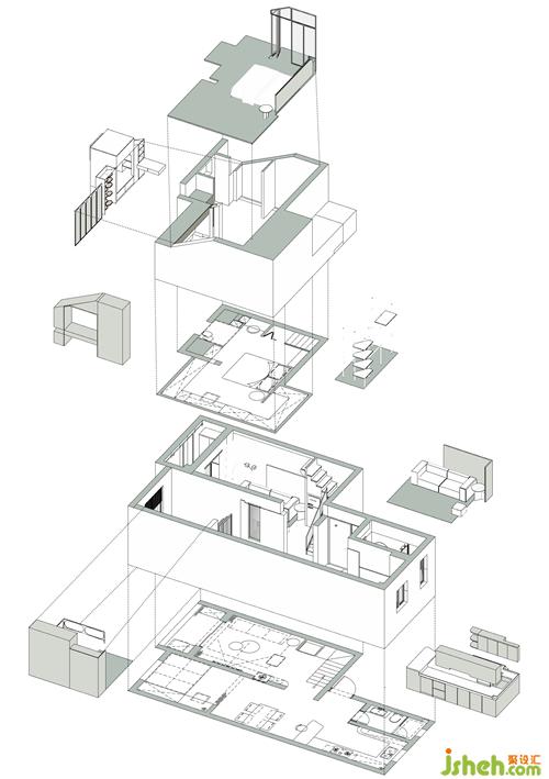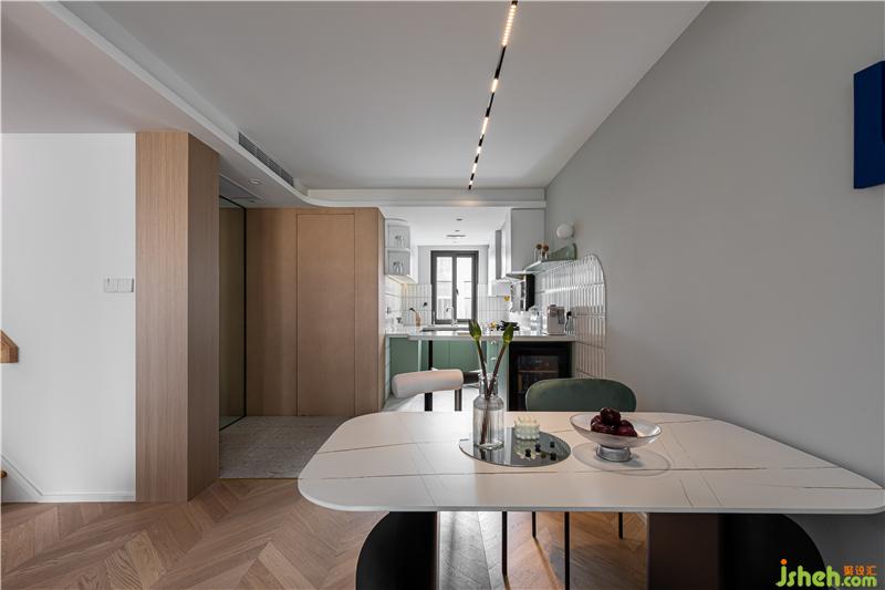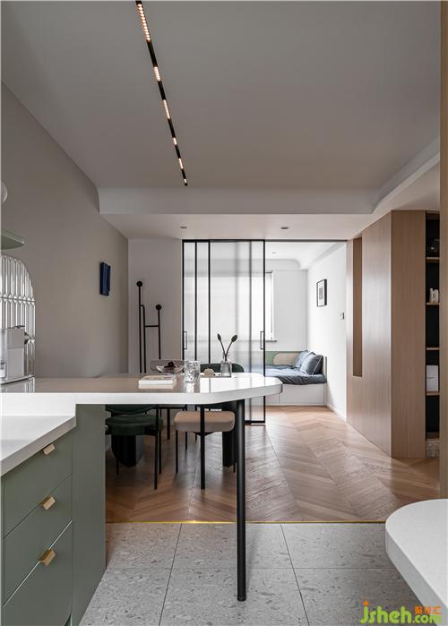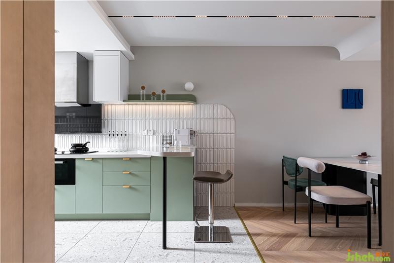 入户映入眼帘的是厨房吧台区,没有过度缓冲,干净的白色立体砖搭配着灰绿色橱柜,墙砖转角处做弧形弱化棱角;灰色的水磨石地砖与木质的地板碰撞张弛有度,室内设计师呈现一种岁月静好的安稳和素朴.