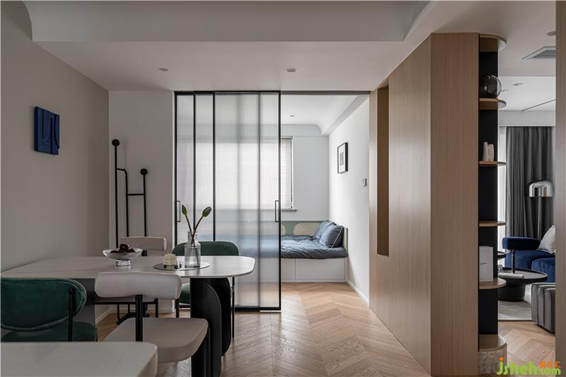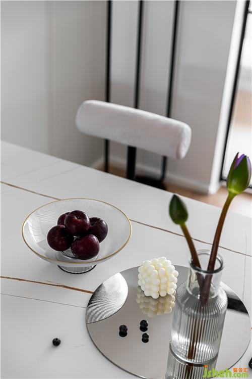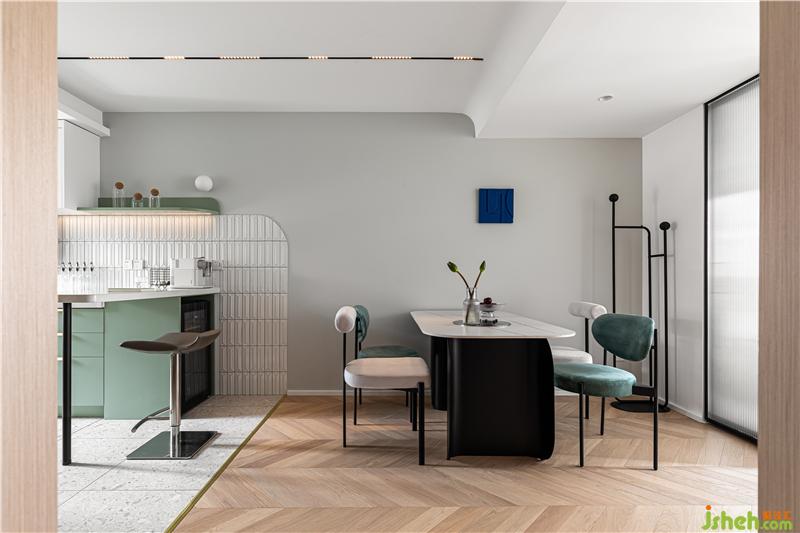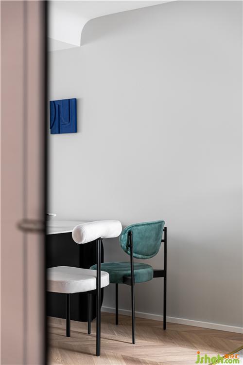 为了弱化建筑结构梁体,吊顶做了弧形处理,增加空间延展性;餐厅位于过度地带则没有过多的装饰,一副蓝色的立体画是点睛之笔,在满足基本就餐需求之余,更多的希望保证这个空间的互动和完整性.