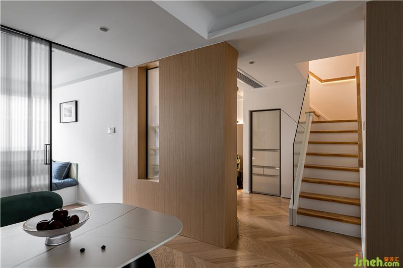 为了保持玄关的整洁统一,卫生间门采用了隐形门的形式;玄关整体木饰面的使用奠定了这个家自然温馨的基调.