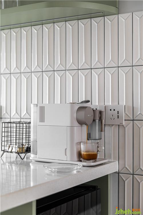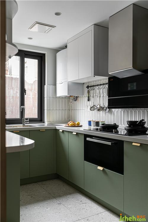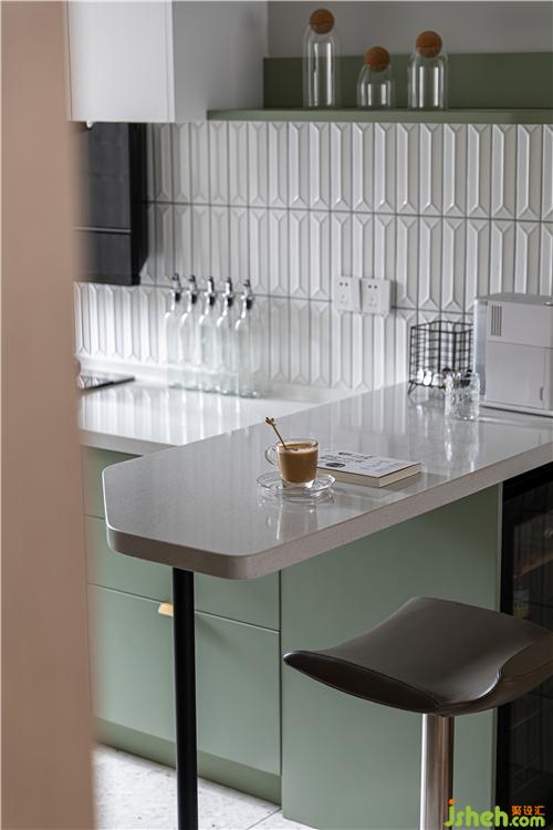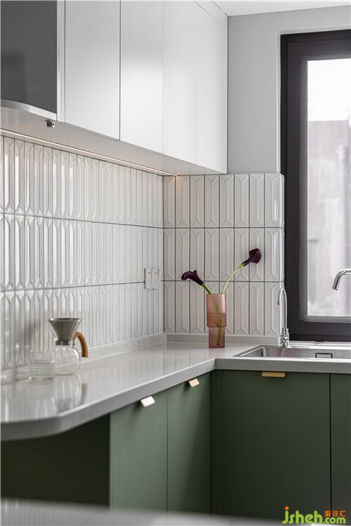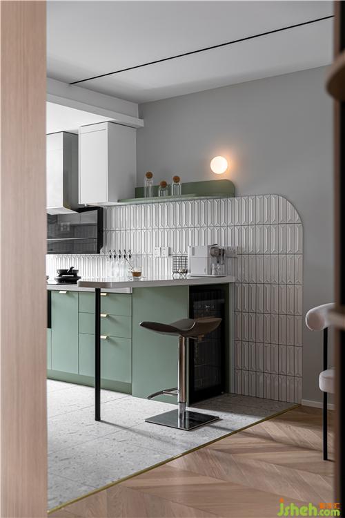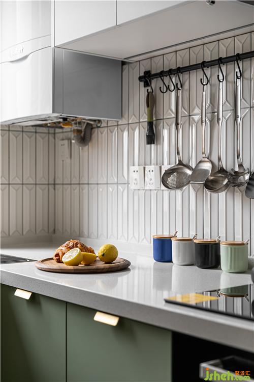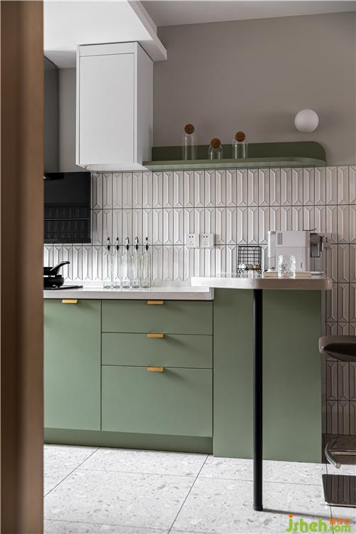 厨房的灰绿色沿用在护墙上,增加视觉联动性,藤编元素的融入彰显空间的柔和气质.