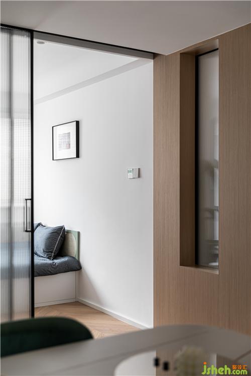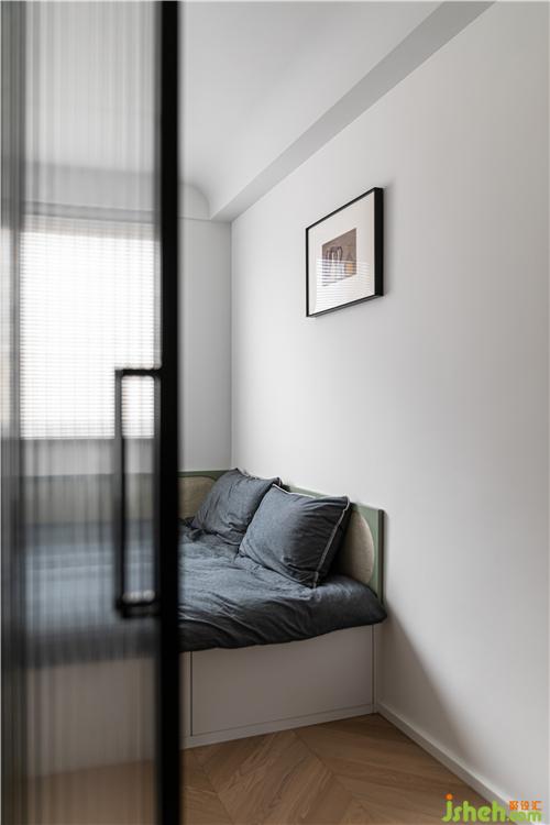 次卧的设计较为简洁,为了最大程度的保证自然光照,设计三门联动,选用超白长虹磨砂玻璃,透光不透影,既保证采光又保护隐私,空间整体搭配明亮柔和