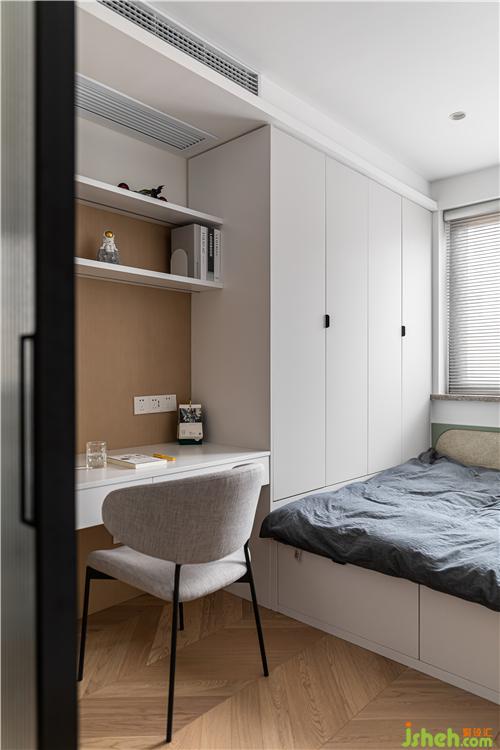 与榻榻米一体的衣柜,延伸出书桌与书架,次卧同时兼具书房的功能.