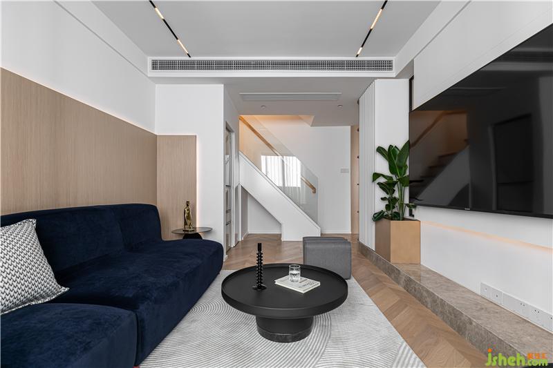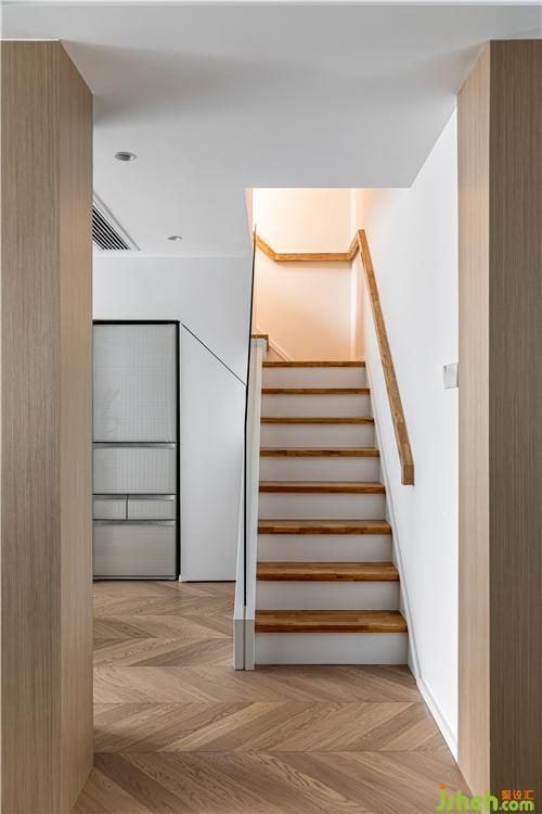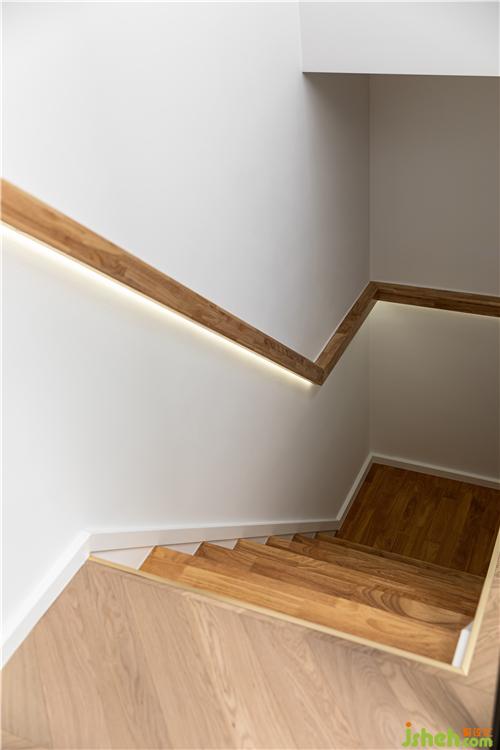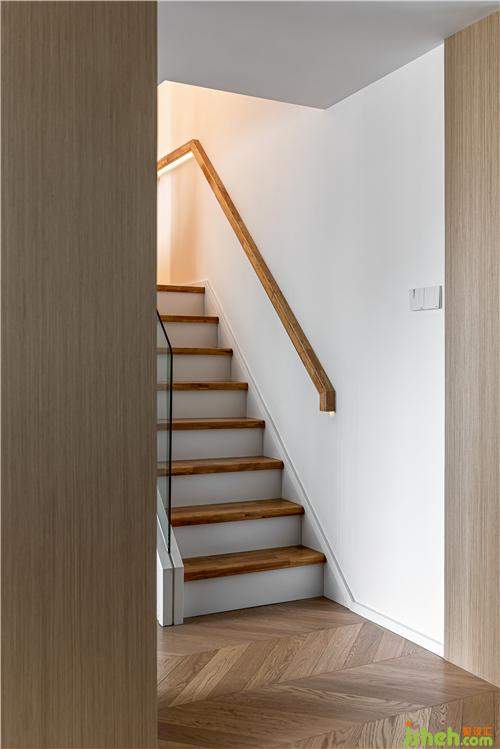 楼梯以白色与木色搭配,扶手贴合墙面,同时配置下射灯带,保证楼梯的独立照明.
