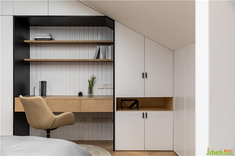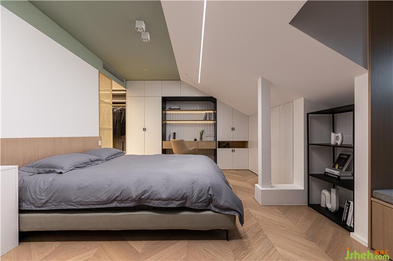附赠的小阁楼,被打造成了业主的私密空间;灰绿色乳胶漆、木饰面辅以精致的藤编隔断,许多元素都与客餐厅形成呼应.