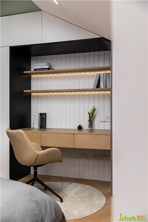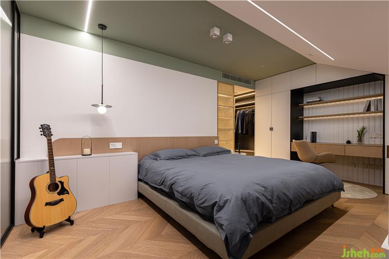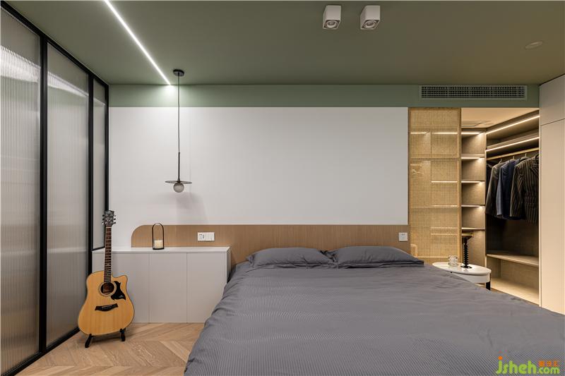 木饰面做的床头背板配合灯带凸显氛围,左侧结合承重结构,用白色门板包裹,打造成床头柜,弱化空间的先天不足.