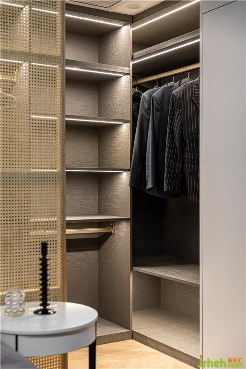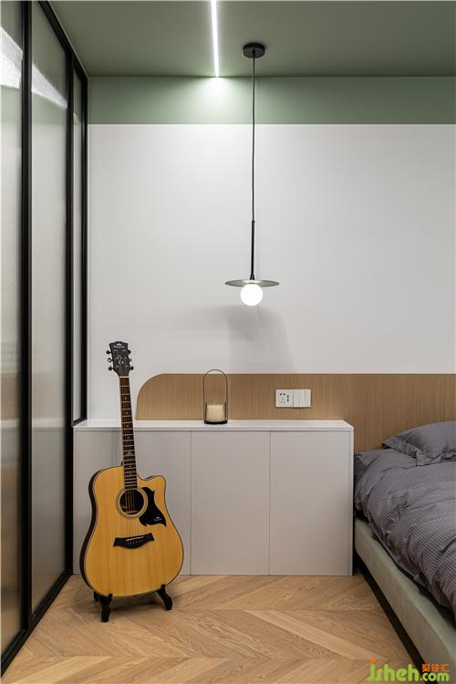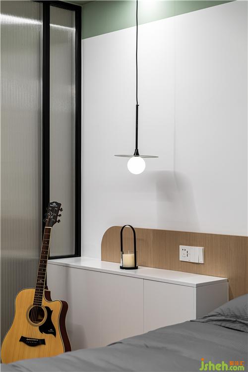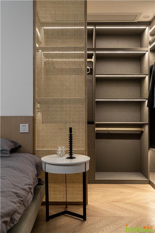 极简圆形床头边几和沉稳简约的藤编隔断组合,产生了材质、色彩与线条的对比,最平常的局部小景因室内设计师混搭手法而变得有质感.