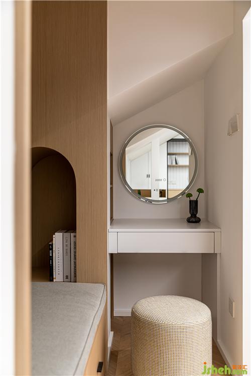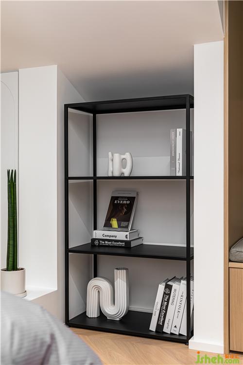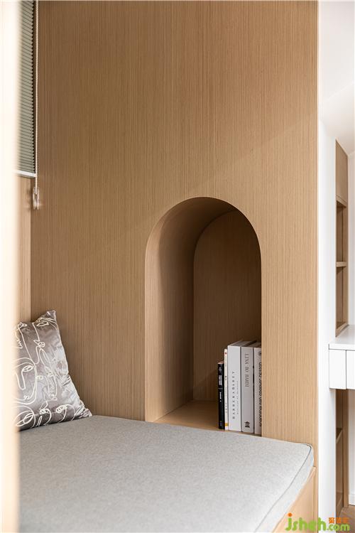 飘窗被木饰面柔和的曲线包裹,唯一的窗户增加了空间的透气性,弧的运用营造一种材料的美感.