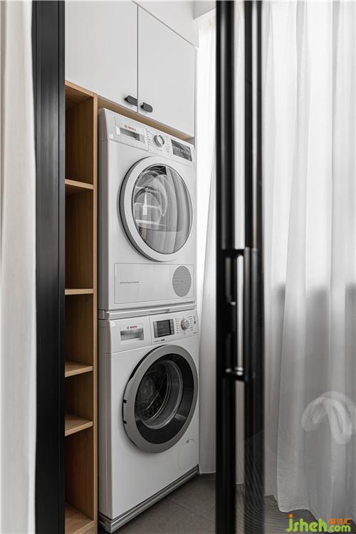 阳台一角,白色门板与木色开放格相呼应,配合自然柔和的光线营造温馨舒适的休闲空间.