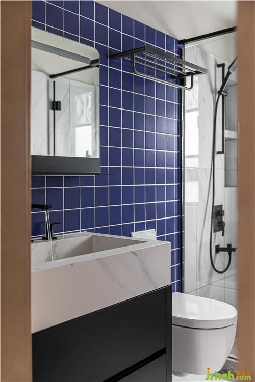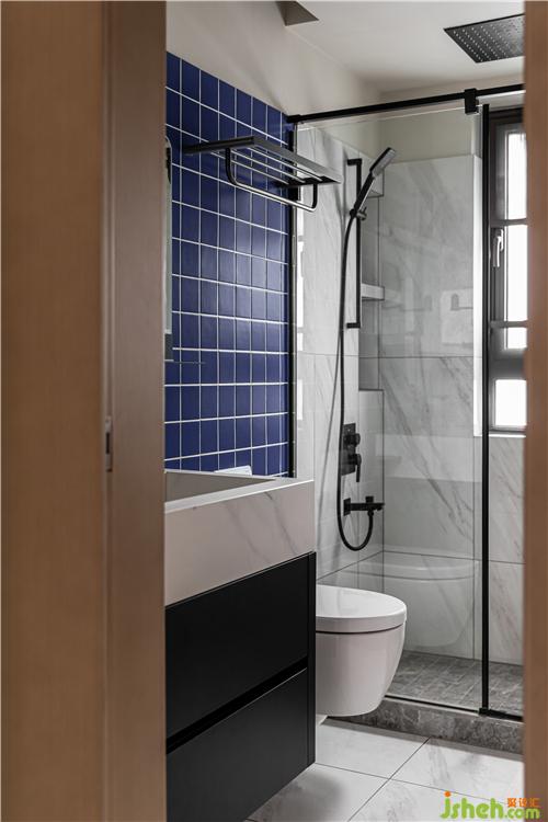 卫生间的设计手法现代又高级,白色的石材砖搭配深蓝色方砖,室内设计师沉稳的色彩,凸显出静谧的气氛;半高瓷砖铺贴手法使空间更加立体.