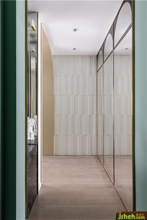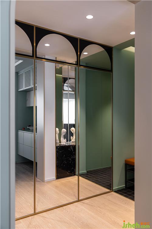 推门入户,装修设计利用墙面乳胶漆分色和地面材质的切换分隔空间,弱化门厅的狭长感. 迎面白色凹凸护墙,突显层次质感. 金属边框、银镜与黑镜组合,彰显复古感的同时延伸了空间,满足了入户全身镜的需求.