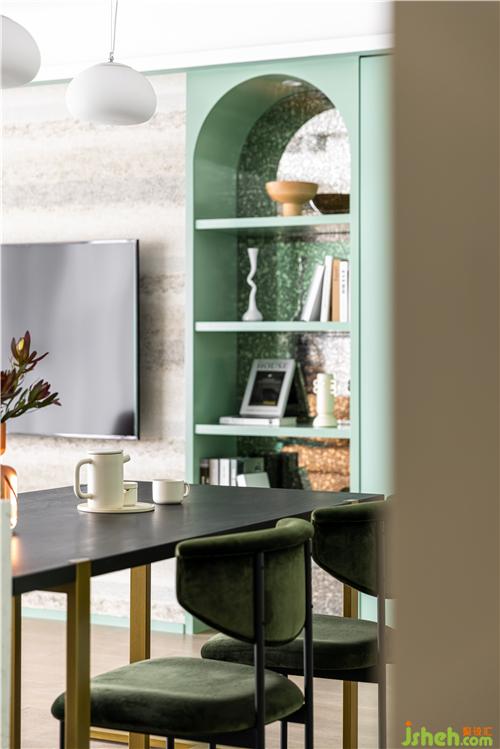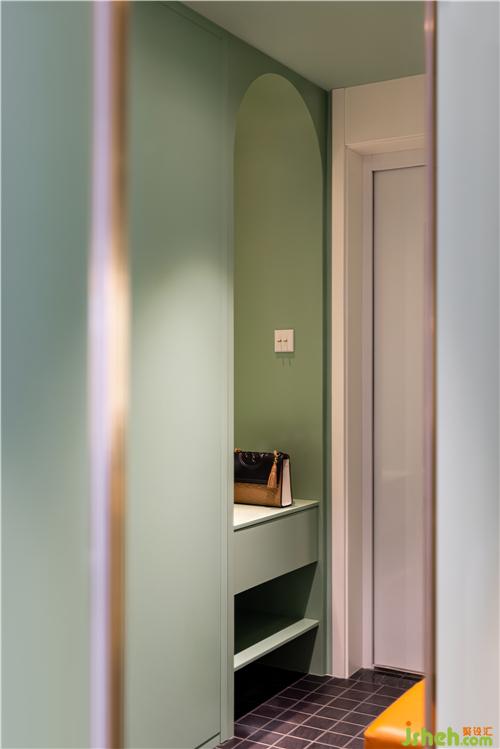 鞋柜绿色烤漆门板,与墙面乳胶漆同色. 鞋柜设置开放柜,挂衣物包包、存放小物品、临时鞋子收纳,功能齐全.