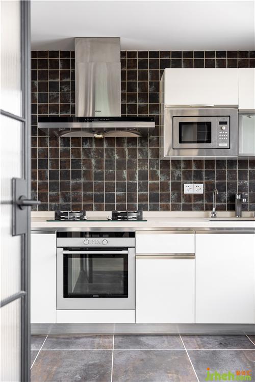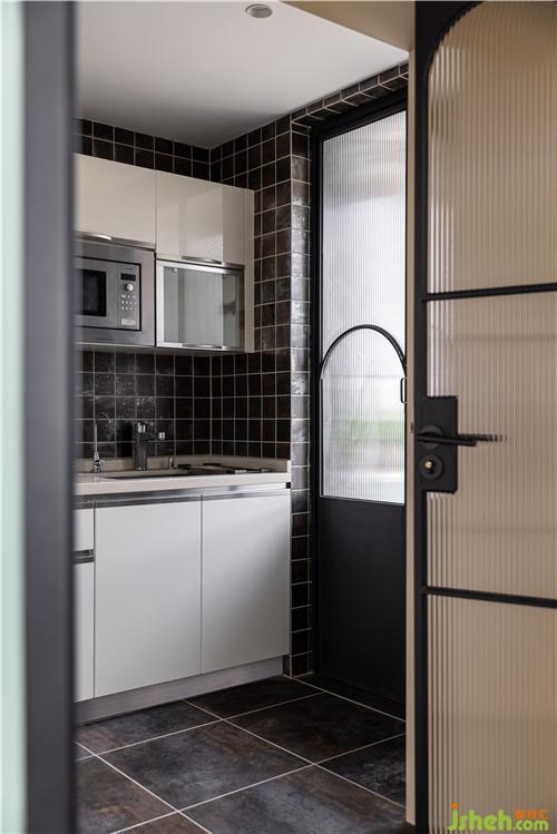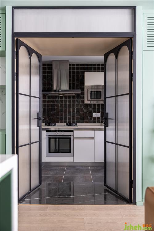 厨房保留原有状态,装修设计定制弧形线条长虹玻璃黑色折叠门,造型复古典雅,与原厨房瓷砖相呼应.