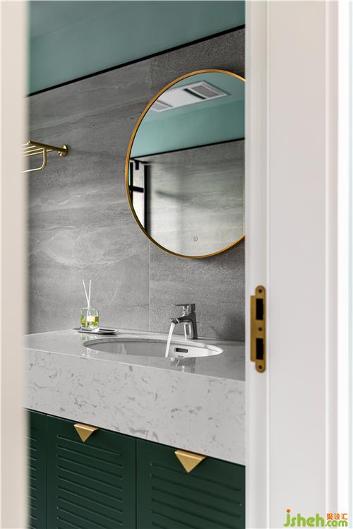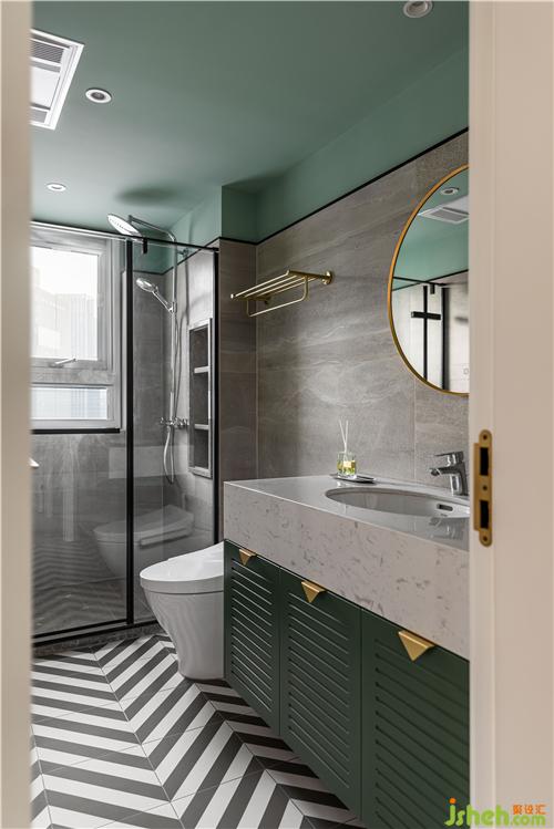 次卫延续了公共空间的绿色调,墙面灰色石纹瓷砖与地面波浪纹花砖呼应,打造整体素雅的质感.