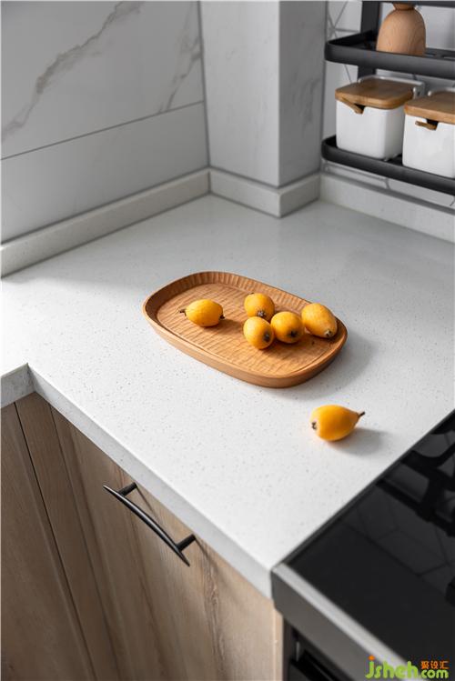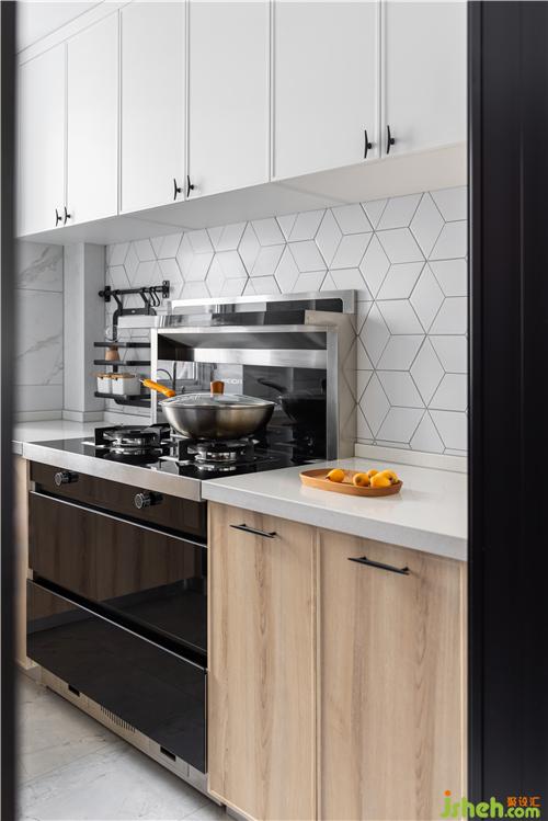 厨房整体设计以简洁实用为主,白色吊柜与木色地柜的柜门形式统一,墙面白色六角几何花砖,为空间增添几分趣味.