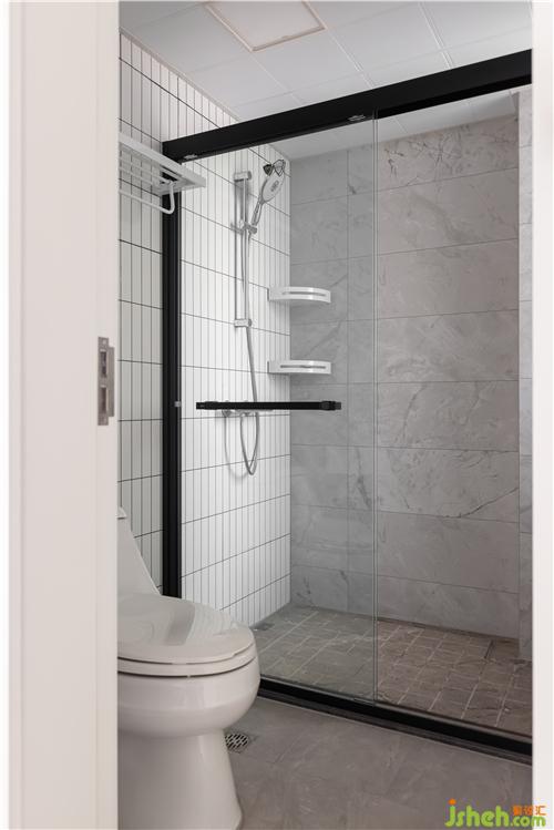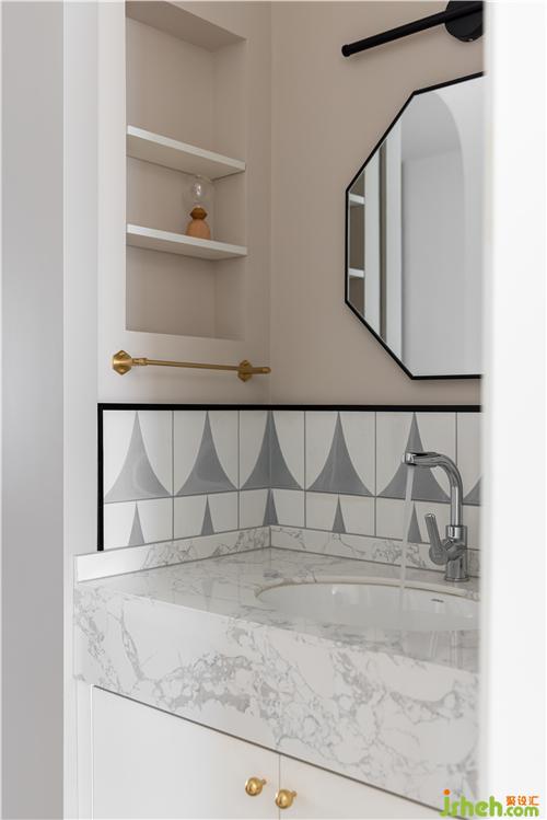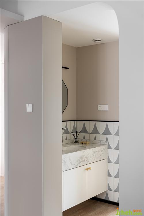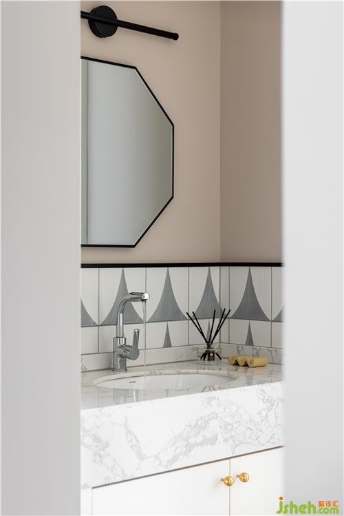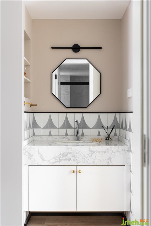 干区半墙几何手工花砖秩序排布,八边形黑框银镜、极简壁灯、黑色金属线条,理性直线与温润奶茶色碰撞,静谧又柔和南京装修设计.