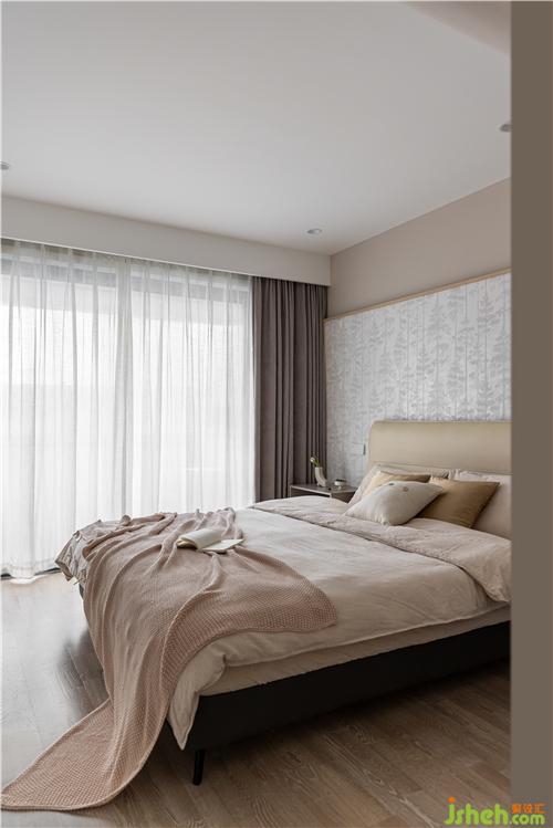 主卧以奶茶色为空间的主色调,吊顶的弧面与背景的曲线呼应,结合背景氛围灯带,营造优雅温柔的空间气质南京装修设计.