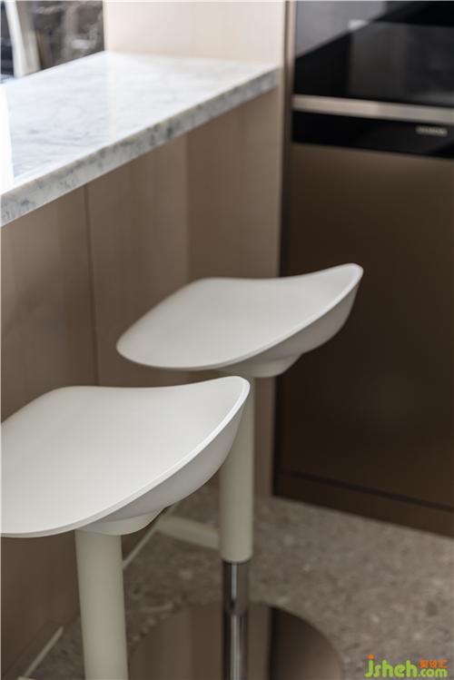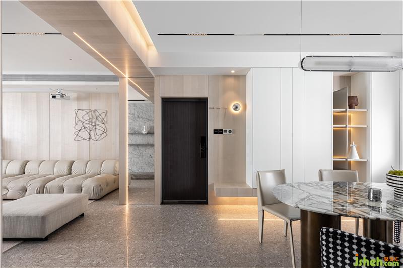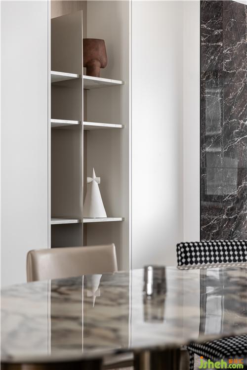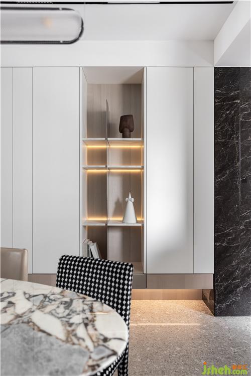白色烤漆柜彰显极简美学,同时暗藏了大量存储空间,让空间保有至高的洁净度,穿插的钢板与鱼肚白层板的展示架,嵌在整面柜体中,微光调和出和谐的幸福味道.