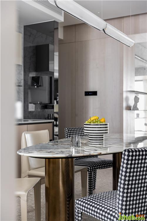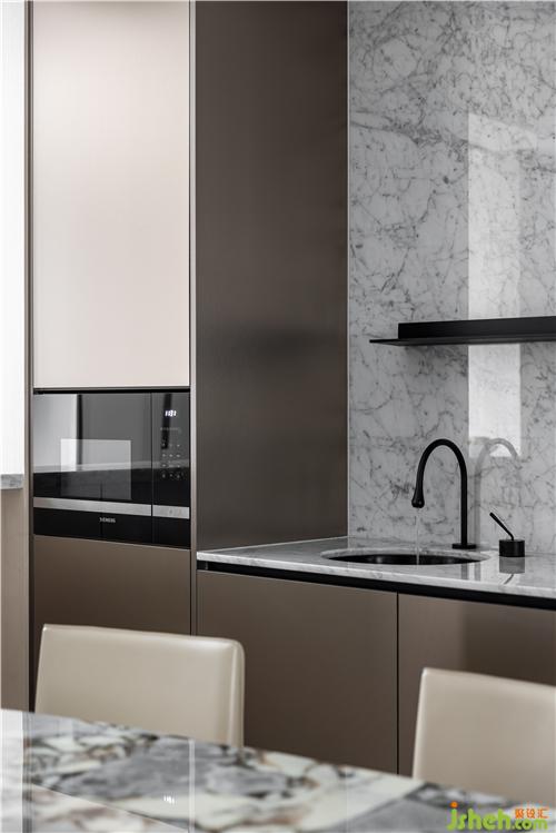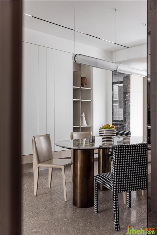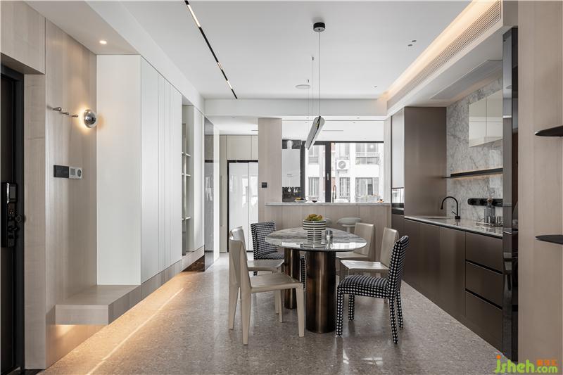 拉丝金属质感的餐柜勾勒出空间的立体感.
