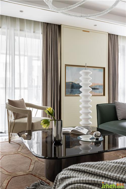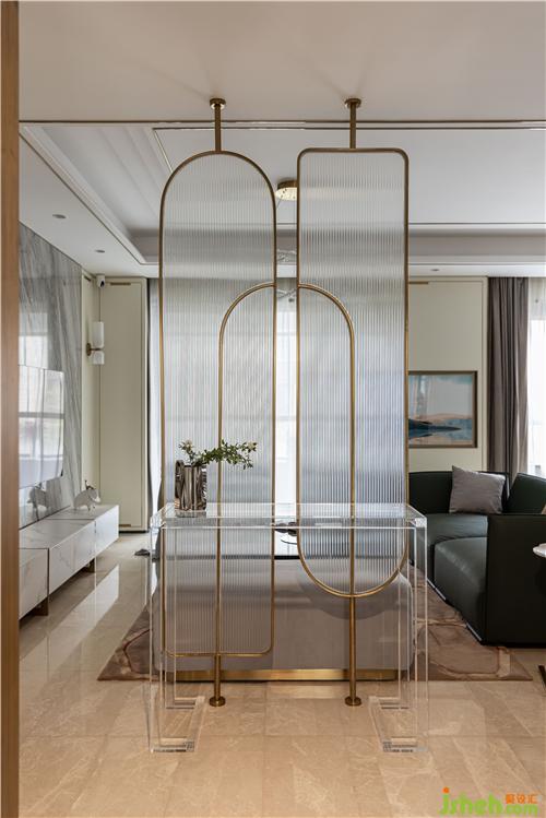 映入眼帘的弧形金属隔断,搭配透明的长虹玻璃,奠定了整个家温暖精致的基调. 透明的亚克力玄关桌通透又有仪式感,入户的美可以消除一天的疲惫.