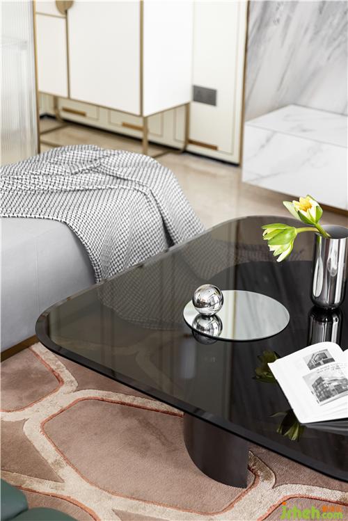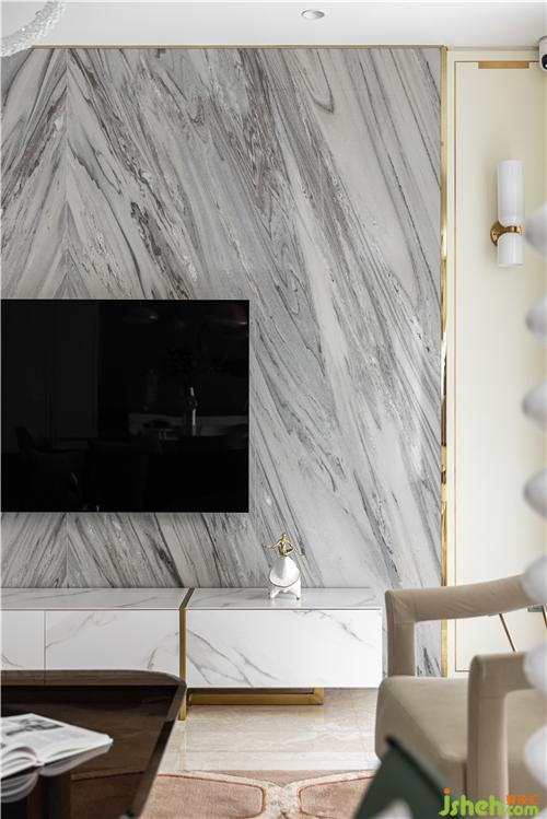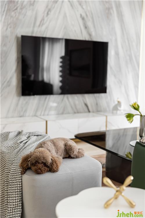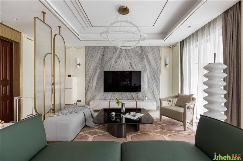 客餐厅是一个整体的横厅空间,客厅区域的电视背景用石材代替原来的栅格设计,与金属走边的护墙拼接来彰显空间的层次感. V型的石材纹理也更具冲击力,南京室内设计师吸引眼球. 墨绿色的沙发搭配黑色玻璃茶几沉稳大气,中和空间的清冷气质,达到审美平衡.