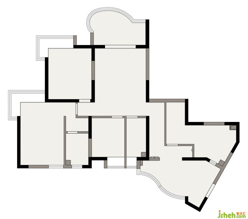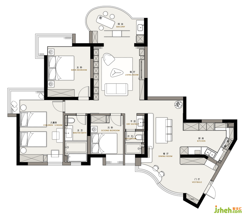 4、儿童房房门内退,取消套卫,设置独立主卫,放置浴缸