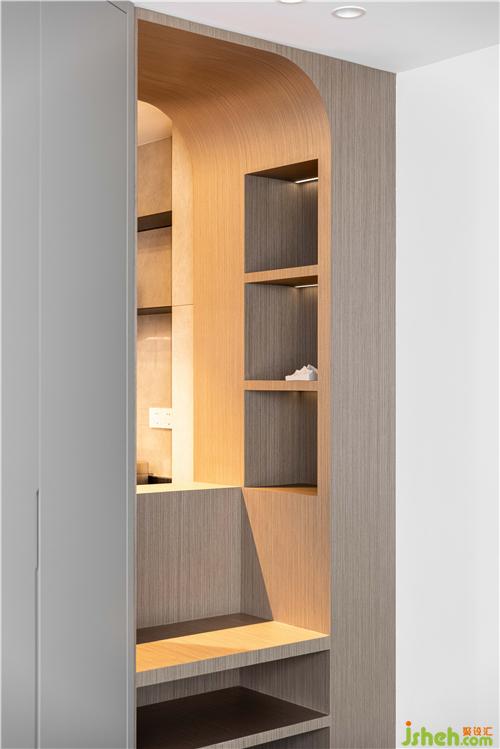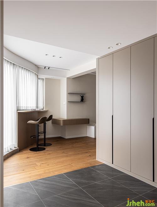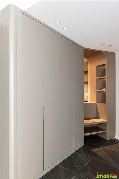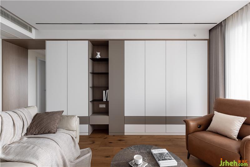 纯净白色中糅合灰色与原木色,营造出轻松自然的居住氛围,大面积的定制柜组合,两侧排布,满足了收纳上的需求,同时也节省了整体的空间,更加的简洁.