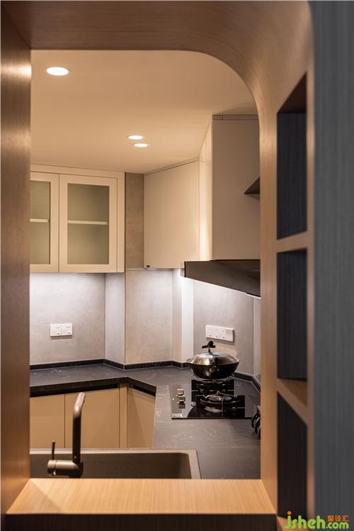整面储物柜为门厅预留出足够的储物空间,理性线条与弧形曲面碰撞的造型卡座,静谧沉稳,与其背后一几窗洞内的烟火气形成鲜明对比,增加了空间的趣味性与互动感.