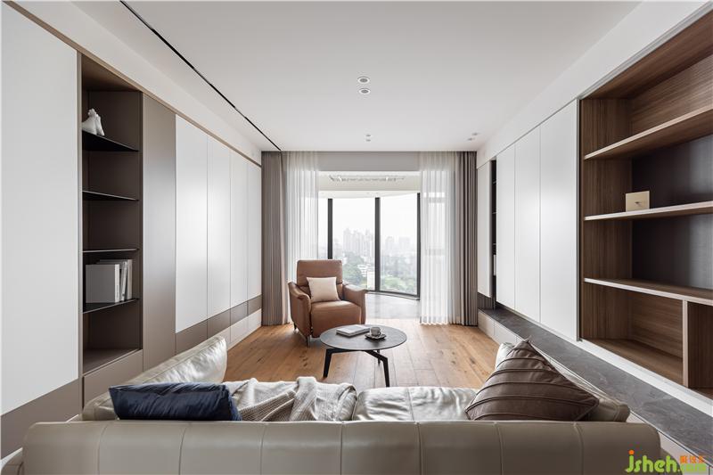 推门入户,干净的灰白色调营造出恬淡静雅的氛围,现代的线条勾勒出艺术情调,空间中加入原木元素,多了份温暖和舒适,轻盈的薄纱将光线引入,呈现出轻松舒适的氛围.