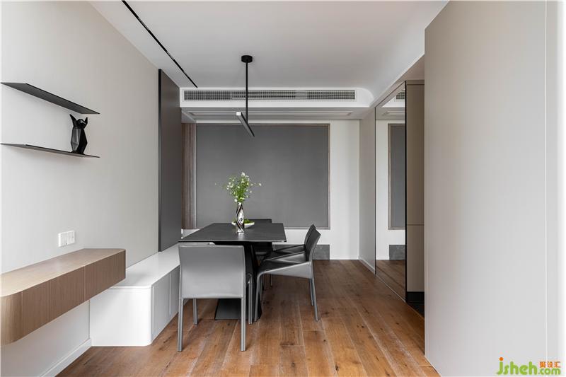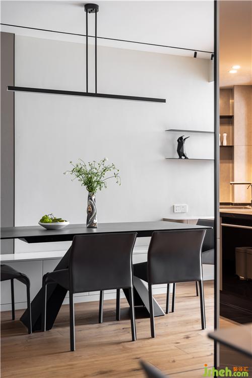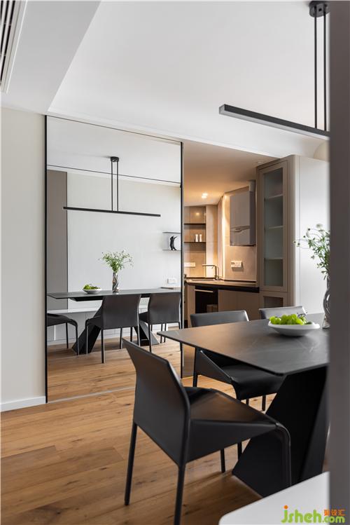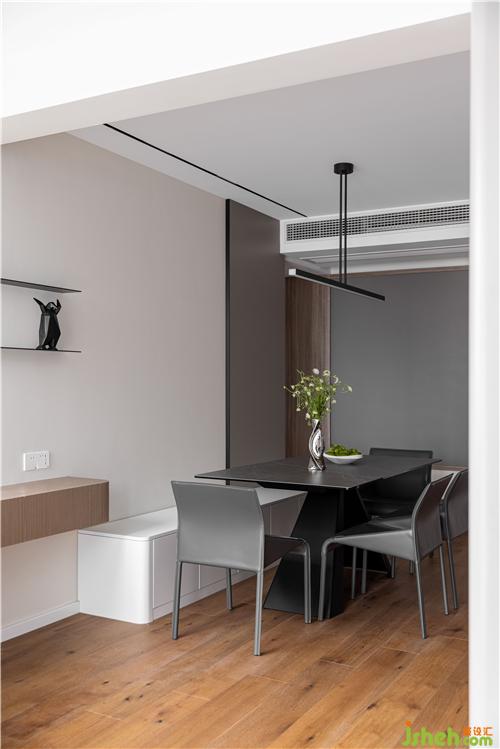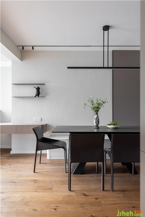餐厅选用与客厅地台同色系的岩板材质餐桌,与原木色地板搭配,气质温润. 绿色植物的点缀南京室内设计师,让整体氛围更加清新明快、生机盎然,开启美妙和谐的用餐时光.