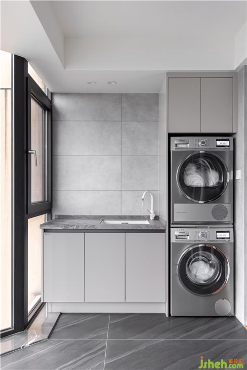 阳台定制洗衣池,洗衣机干衣机上下叠放,空间整洁利落,沿用厨房与门厅地面同款地砖,色系统一.