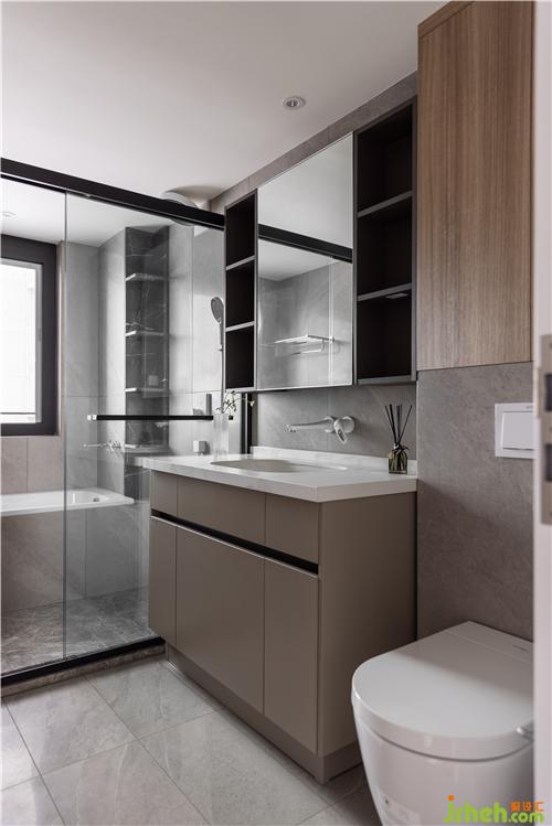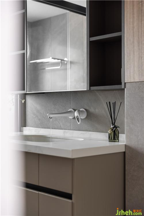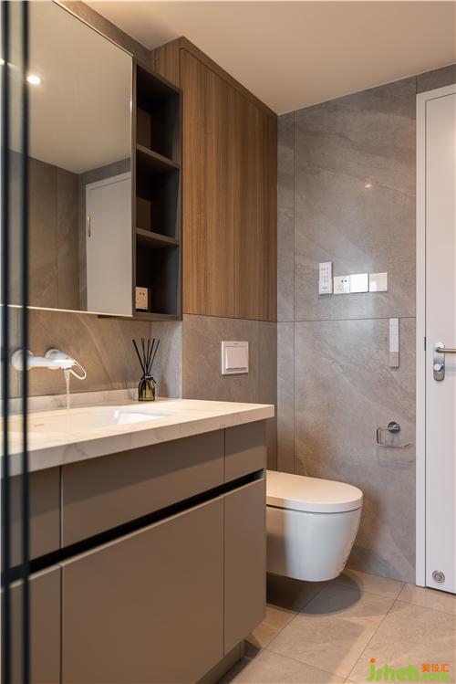 主卫打破传统布置方式,台盆内置,如厕区与淋浴区分开,避免细菌滋生. 镜柜结合开放架形式,方便日常洗漱用品放置,同时利用壁挂马桶的墙体构造,增加储物空间.