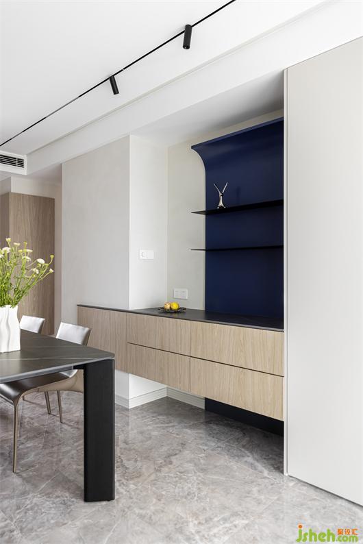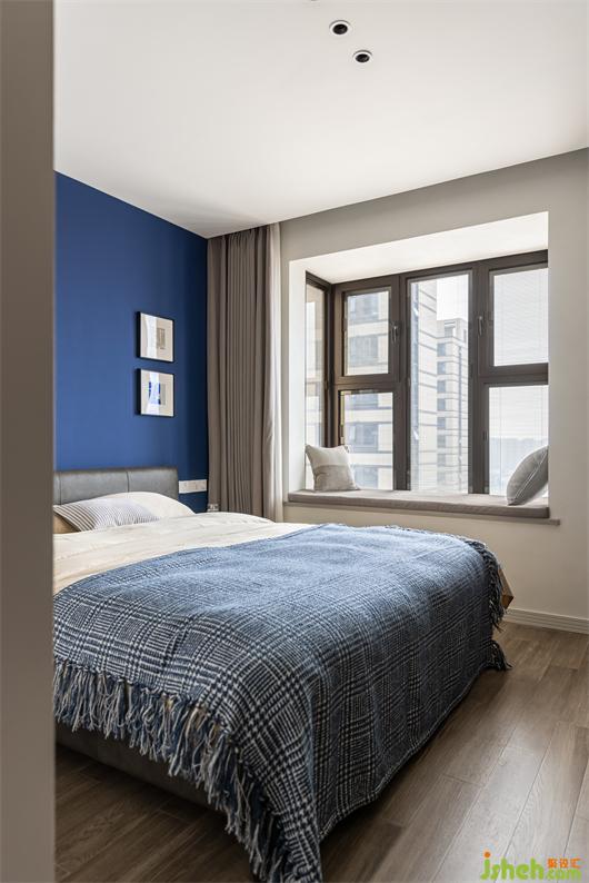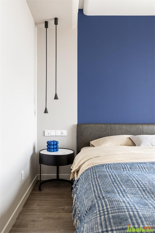 主卧以克莱因蓝为颜色元素 ,也是空间的气质引现,它是沉稳且富于沉淀的,它决定了空间最重要的氛围感和气质属性,传递一种被蓝色环绕且放松的情绪,希望带给屋主舒适的居住体验.