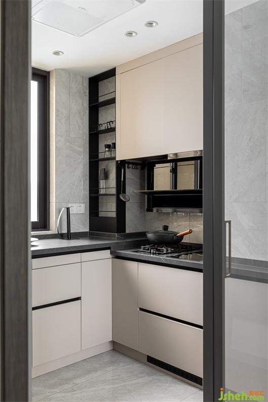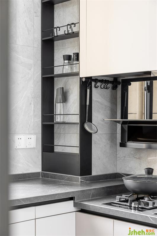 厨房设置高低台面,符合人体工学,炒菜洗菜更加轻松. 定制钢板置物架,释放台面空间,干净整洁.