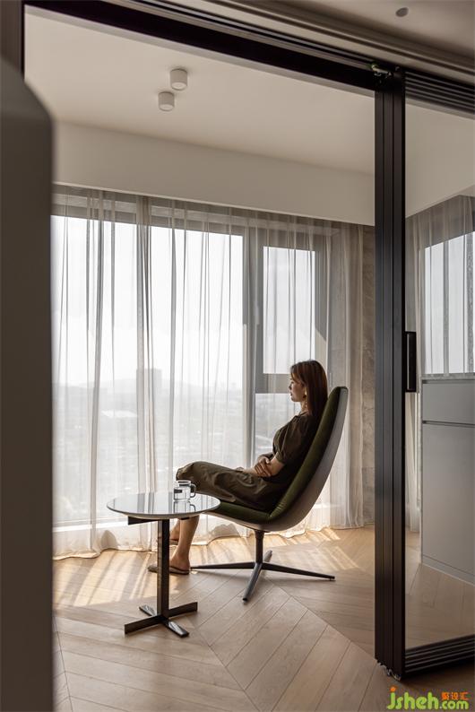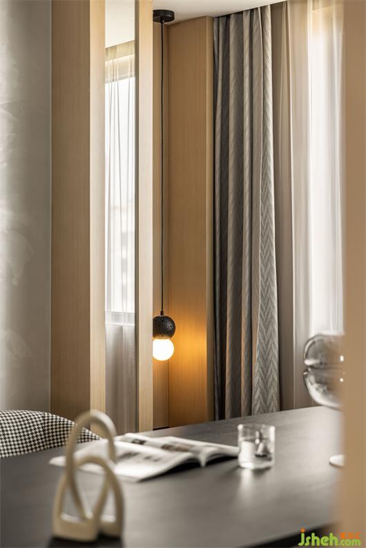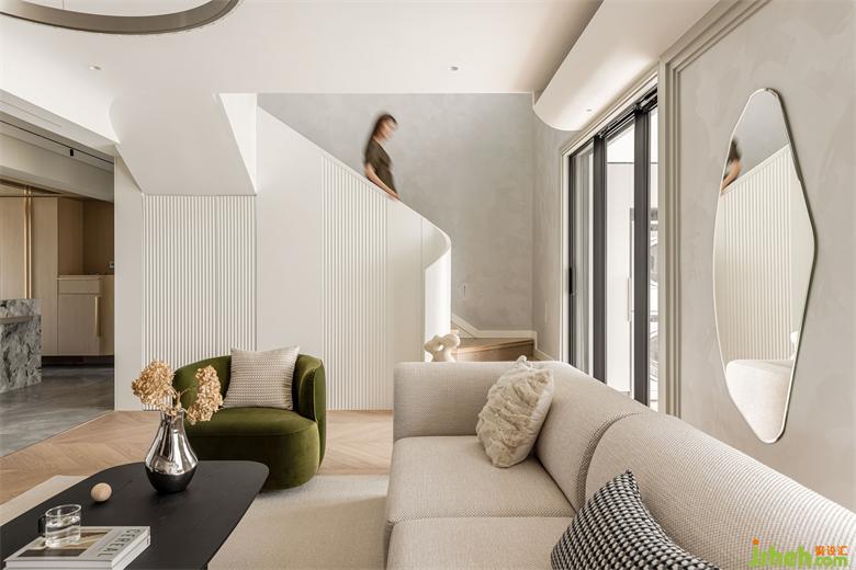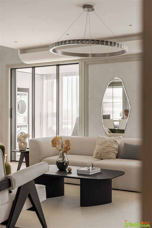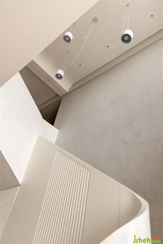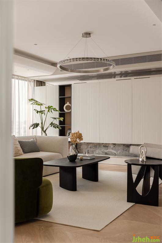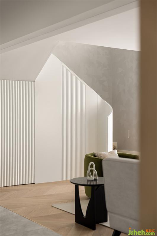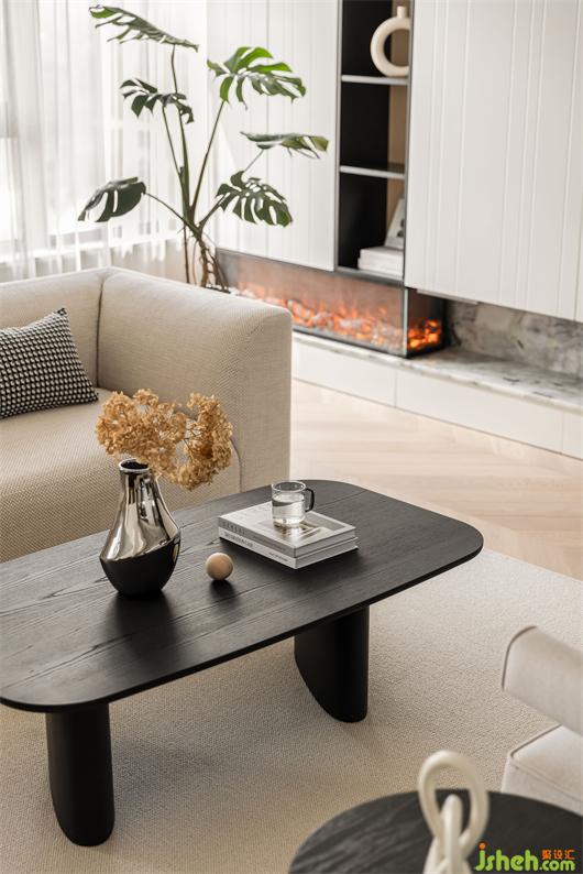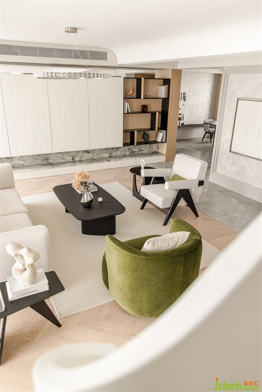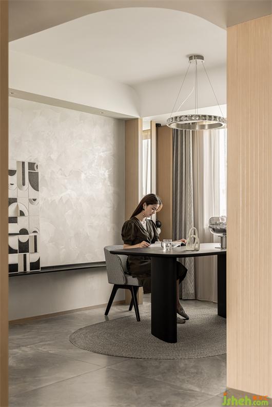 花漾美作弧形吊顶设计使视觉上更柔和,书柜同样也是运用圆弧处理手法,大量藏书有了安放之处,拾一本书,品一壶茶,让心灵在此处找到最舒适的状态。